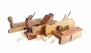 A hand plane is a carpentry woodworking tool that is used to shave thin, uniform layers of wood from a workpiece. It is made up of a blade, also known as an iron, that is held in place by a wedge. The blade protrudes from the bottom of the plane, and when the plane is pushed across the surface of the wood, the blade shaves off a thin layer of wood, leaving a smooth surface behind.